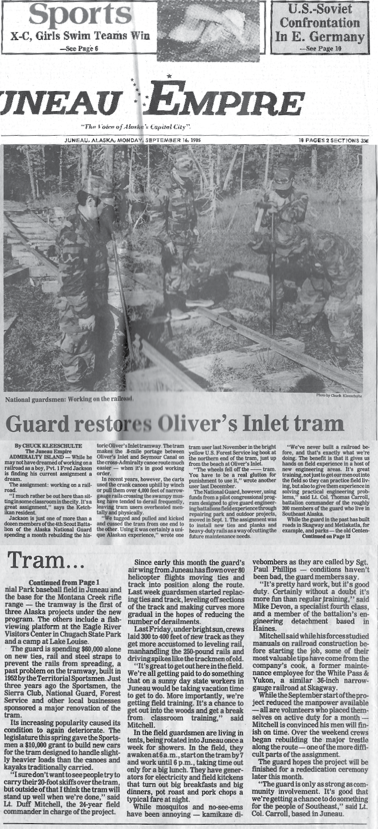 Revamping the tramway was deemed a great project for a new program to give the Alaska National Guard engineering battalions field experience by repairing park infrastructure, the Empire reported. In summer of 1985, the guard's air wing in Juneau flew more than 80 helicopter staging flights, setting ties and track along the route.